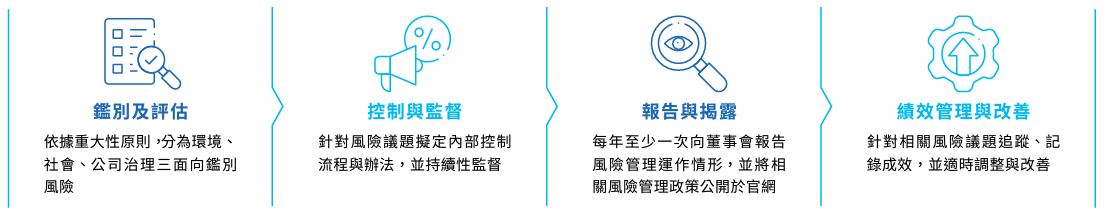 在管理階層中,則以「ESG推動組織」為最高監督及指導單位,由總經理擔任召集人,副總經理擔任管理代表,帶領經營團隊督導ESG風險管理業務之推動,依風險危害之潛在影響程度,擬定公司因應策略,督導各項專案之落實並每年鑑別ESG風險及機會。